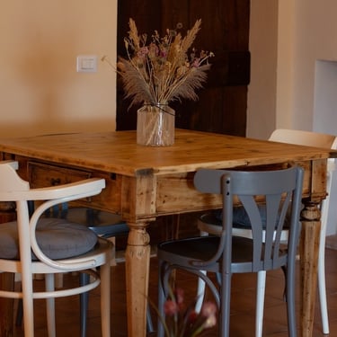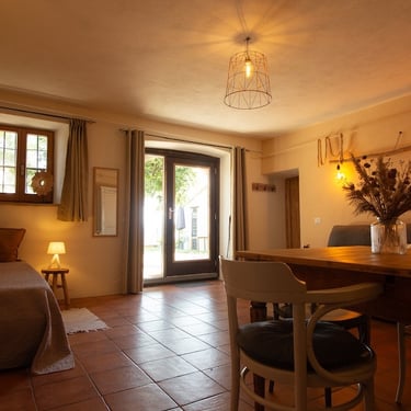 Buiten het appartement staat een tuinmeubelset met parasol voor je klaar.